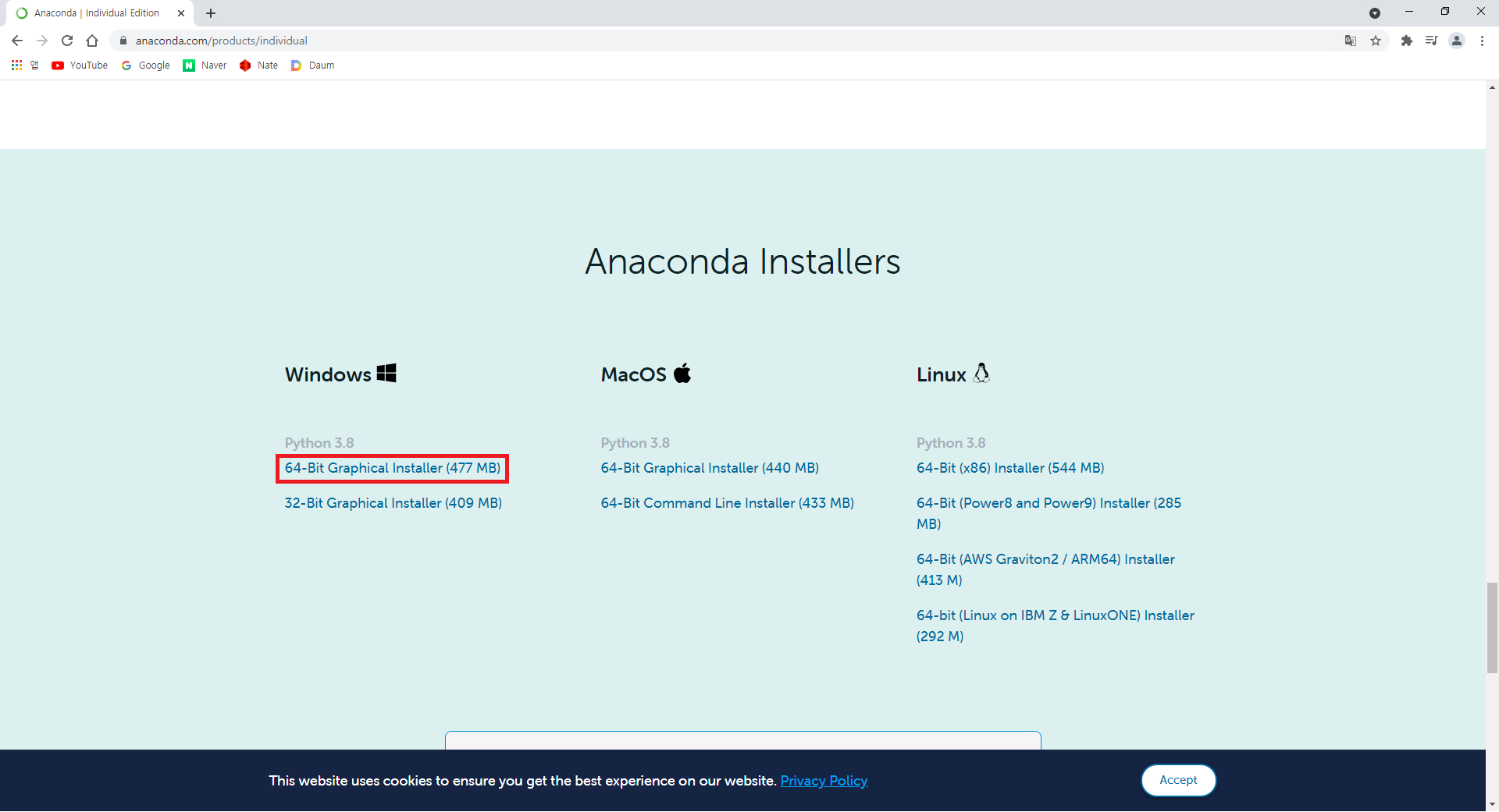 - OS에 맞는 Anaconda 설치 파일을 클릭합니다.