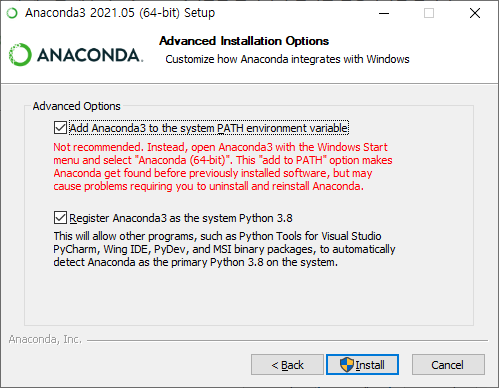 - 첫번째 체크 박스를 클릭하지 않으면, cmd 창에서 anaconda 관련 명령어를 사용할 수 없습니다.